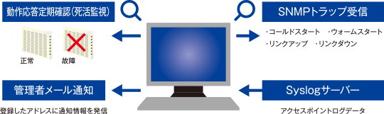 アクセスポイントの死活監視など、機器のトラブル発生を事前に確認することができ、故障した際にはメールで通知します。