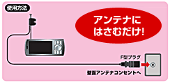 F型プラグをテレビアンテナコネクタに接続し、もう片方のクリップをワンセグ機器のアンテナにはさんで設置完了。簡単手軽に受信感度がアップできます。