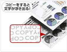 本製品に印刷した書類・資料をコピーすると、コピーした側の用紙に「COPY」の文字が浮き出て、コピーをした証拠が残るので原本との判別が容易にできます。改ざんを防止したい書類、重要会議の資料、社内マニュアル、原本確認が必要な書類、処方箋、チケット、社内証明書などの管理にお役立てください。