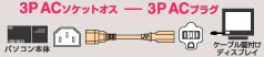 パソコン本体の電源サービスコンセントに、ディスプレイに直付けされている3P(2P)電源ケーブルを接続するためのケーブルです。