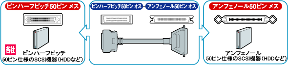 ピンハーフピッチ50ピンとアンフェノール50ピンの各々コネクタ仕様の異なるSCSI機器同士を接続するケーブルです。