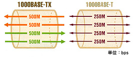 「1000BASE-T」と「1000BASE-TX」ではケーブルを構成する4ペアのツイストケーブルの使い方が異なります。「1000BASE-T」では1ペアごとに250Mbps(250Mbps×4ペア=1000Mbps)で送信と受信を兼ねるのに対し、「1000BASE-TX」では送信に500Mbps×2ペア、受信に500Mbps×2ペアを使用します。1ペアあたり500Mbpsでの伝送が可能なのはカテゴリー6規格のケーブル品質にそこまでの余裕があるからです。