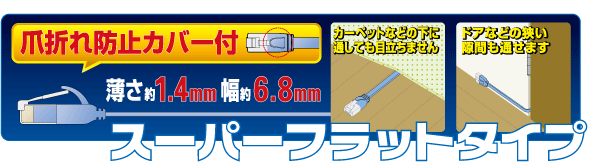 カーペットの下やドアのすき間に配線できる薄さ「約1.4mm」、幅「約6.8mm」のスーパーフラットタイプです。 |