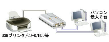 2台のパソコンで1台のUSBプリンタやストレージ機器を切り替えて使用できる切替器。Windowsのタスクトレイから切替ができるため切替器の設置場所の自由度が増します。USB1.1対応。 |