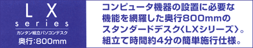オフィスでのパソコンシステム構築に要求される様々な機能を満たすべく設計されたLXシリーズ。すっきりとケーブルを隠す二重パネルや、スイッチ付コンセントを装備しました。組立て時間も1台あたり約4分の新機構を採用し、従来品に比べて搬入・設置にかかる手間を大幅に削減。また、デスクオプションが豊富で、快適なパソコン周辺環境作りを実現できます。