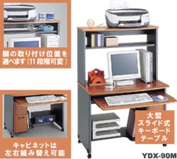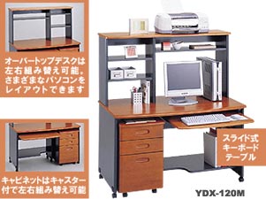 パソコン機器を思いのままに設置できるホーム用パソコンデスクです。ボックス型オーバトップデスク、キャビネット装備で収納力もたっぷり。また、レイアウトに応じて左右の組み替えが可能です。