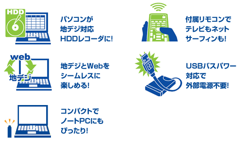 WindowsパソコンにUSB接続するだけで地上デジタル放送の特長である高画質なハイビジョン放送を楽しめる地上デジタルチューナーです。