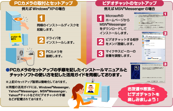 ● Windows Messenger、MSN Messenger、Yahoo!メッセンジャー、Yahoo!チャット、Windowsムービーメーカー2、Windowsムービーメーカーを使用したビデオチャットやムービー撮影の手順を記した活用ガイド付