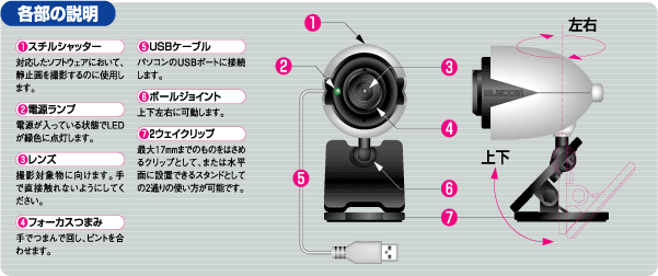 ● カメラにはクリップとスタンドの2通りに使える2ウェイクリップ採用。ノートパソコンの液晶モニタなどに取り付けられる他、平らな面に設置できます