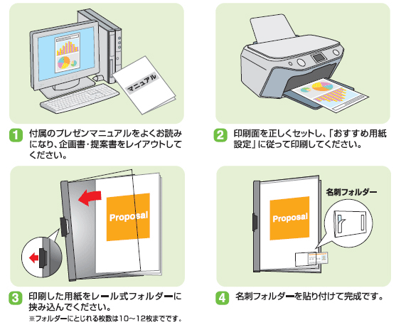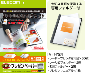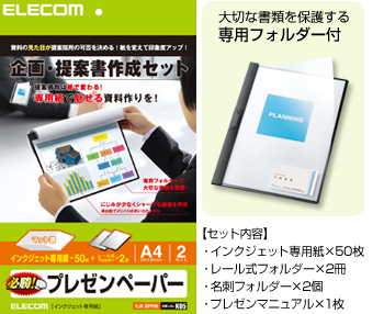 企画・提案書の作成に最適な専用紙について、用紙とフォルダーをセットにした「プレゼンペーパー」です。読み手に内容が伝わりやすく、印象的な企画・提案書を作成するには、文字のみではなく、グラフや写真、図などを使って視覚に訴えることも必要です。プレゼンツールを使って作成した企画・提案書を、「コピー用紙」などの普通紙に印刷してしまうと、文字のかすみやにじみが発生したり、写真やグラフ部分の紙にしわが寄るなど、うまく仕上がらないことがあります。せっかく写真や図などを使って工夫した資料も、これでは台無しです。エレコムの「プレゼンペーパー」は、そのような悩みを解決し、いつもの企画・提案書を美しく魅力的なものに変身させることができます。 |