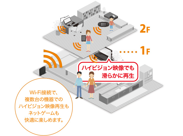 「11ac」は快適通信を実現する次世代規格です。家中で超高速Wi-Fi通信が可能となります。さらに、転送できる情報量も大幅にアップ、複数台の機器が同時利用(従来規格11n/a/g/b搭載機器も)可能になります。