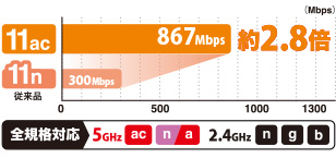 従来規格の約2.8倍の超高速通信を実現次世代規格「11ac」採用