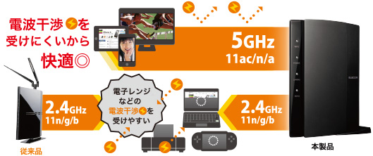 2.4GHz帯の無線LAN 11n/g規格と、電波干渉に強い5GHz帯の11n/a規格のデュアルバンドに対応により、快適な高速Wi-Fi通信を利用できます。