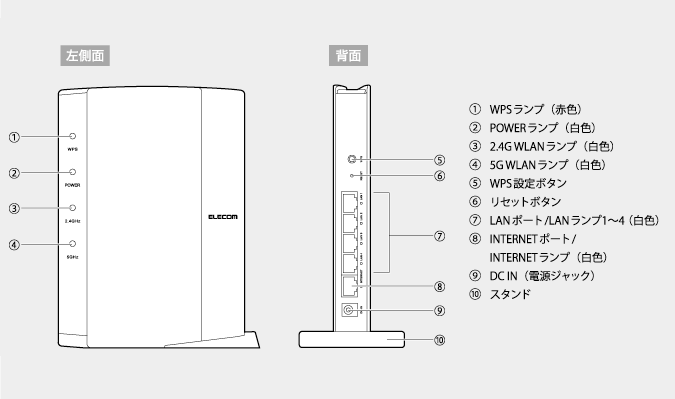 | 伝送速度(理論値) | IEEE802.11ac : 最大867Mbps IEEE802.11n : [2.4GHz]最大600Mbps※、[5GHz]最大300Mbps IEEE802.11g : 最大54Mbps IEEE802.11b : 最大11Mbps IEEE802.11a : 最大54Mbps ※600Mbpsでの通信は、子機が256QAMでの通信に対応している必要があります。 |