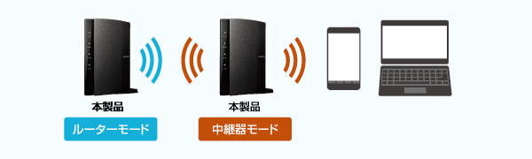 本製品を中継器モードに変更することで、Wi-Fiの電波が届きにくい場所も快適にインターネットができます。