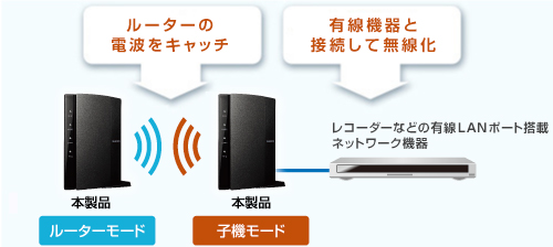 本製品を子機モードに変更することで、有線LANポートを持つネットワーク機器を無線化することができます。