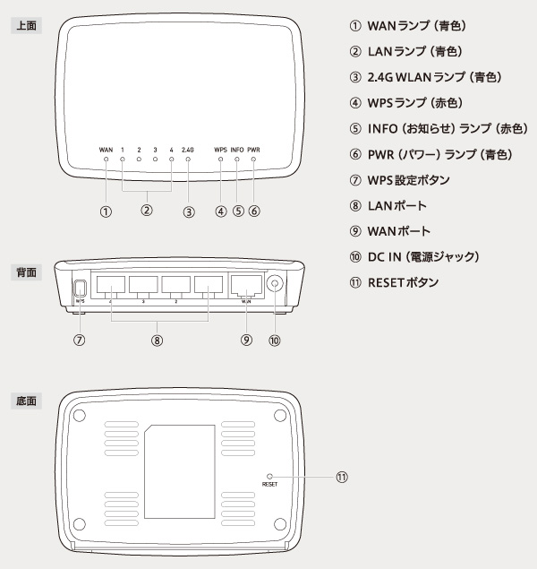 | 主な製品構成 | 無線LANルータ 1台, ACアダプター1個, LANケーブル 1本, CD-ROM 1枚, 各種マニュアル 3枚, 設定情報シート※ 1枚, IKARUSライセンスシリアルカード 1枚, U-NEXTカタログ 1枚 |