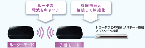 本製品を子機モードに変更することで、有線LANポートを持つネットワーク機器を無線化することができます。