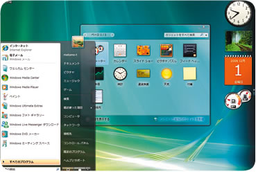 標準ではデスクトップ右側にある画像や時計。これは「Windowsサイドバー」と呼ばれる領域の上に、「ガジェット」と呼ばれるミニアプリケーションを配置する、Windows Vistaの新機能だ。ガジェットにはアナログ時計やRSSリーダー、カレンダーなどが用意されており、必要に応じて追加/変更することができる。また、普段はサイドバーを隠すこともできるほか、ガジェットをデスクトップ上に直接配置するといった、柔軟な使い方も可能となっている。