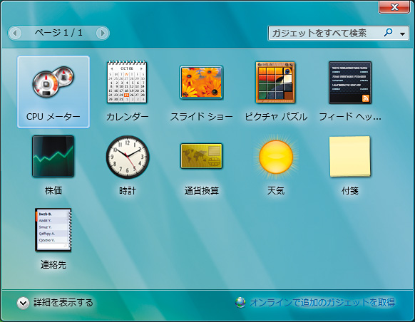 サイドバーに配置するガジェットは、好みに合わせてカスタマイズ可能。標準でいくつかのガジェットがあらかじめ用意されており、ドラッグ&ドロップで手軽に追加や配置変更が行なえる