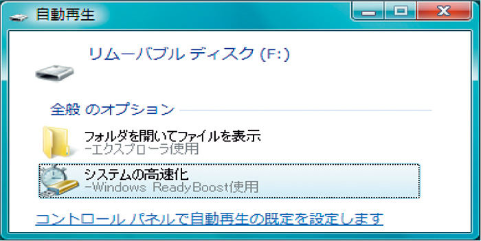 USBメモリを装着すると、自動再生ダイアログでフォルダを開くか、システムの高速化を行なうか、選ぶことができる