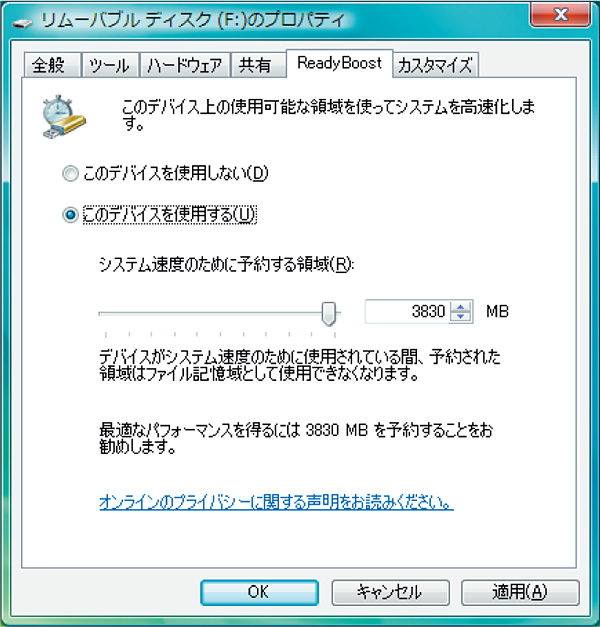 ドライブのプロパティでシステム高速化のために割り当てる容量を増減できる。割り当てた領域は、通常のUSBメモリのデータ領域として利用できない