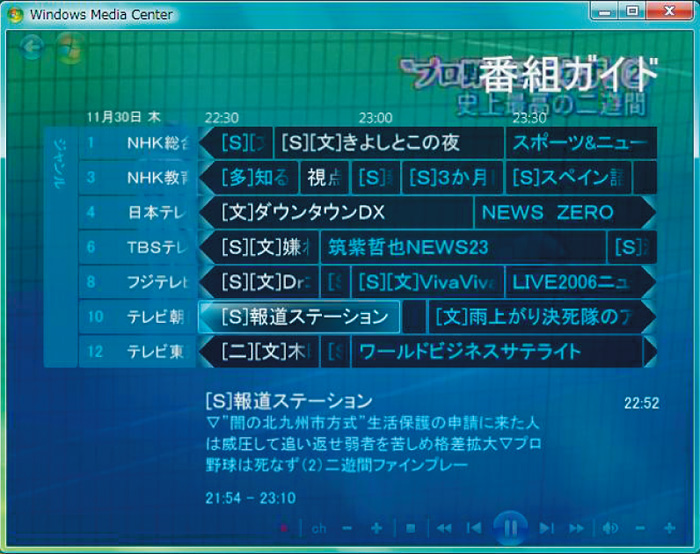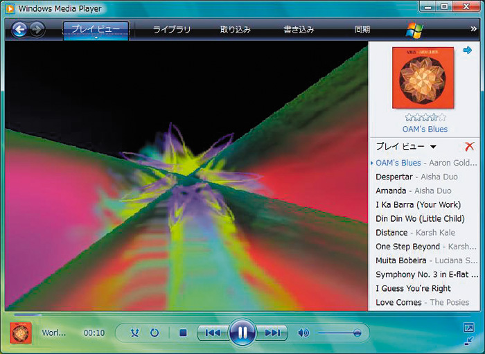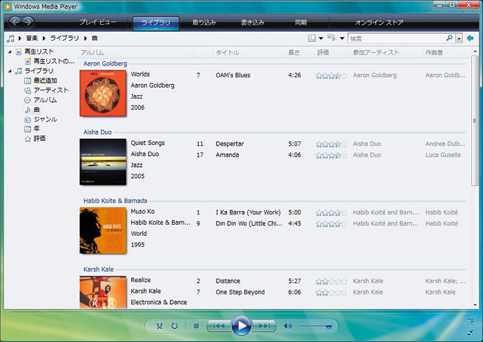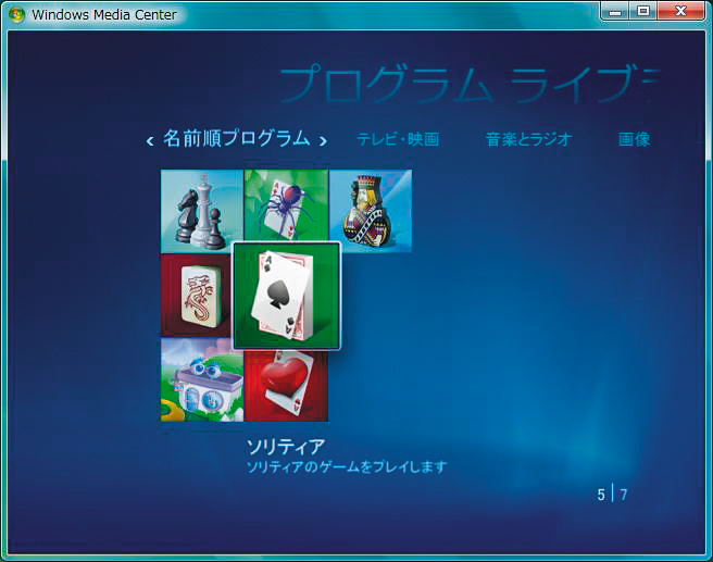 Windows Vistaに標準搭載される「Windows Media Player 11」は、インターフェースが一新され、使いやすくなった。従来のテキストベースの一覧からジャケット写真を使ったグラフィカルなライブラリ管理に変わり、アーティストや年代、ジャンルなどの条件で抽出結果をスタック表示するなど、直感的で効率のよい音楽鑑賞環境を実現している。マルチメディア系の機能として、もう一つ注目したいのは10フィートGUIを持つマルチメディア統合環境「Windows Media Center」だ。VistaではHome PremiumとUltimateに標準で搭載されており、よりユー ザーフレンドリーなメディア再生環境を実現している。