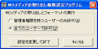 2000の環境でMOメディアのフォーマットやイジェクトを行う場合は、「Administrator」権限が必要となりますが、本ツールを使用することにより、「User」権限でもMOメディアのフォーマットやイジェクトが可能になります。
