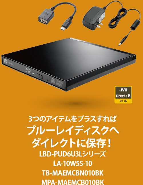 「ポータブルブルーレイディスクドライブ」「USB変換アダプタ」「ACアダプタ」の3つのアイテムをプラスすれば、「EverioR」とダイレクト接続して、動画をブルーレイディスクにダビング。パソコンがなくても、大切な動画を保存できます。